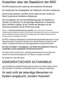 Die BRD bezeichnet sich selbst als demokratischer Rechtsstaat.Sie verfügt über kein Staatsgebiet, kein Staatsvolk und keine VerfassungDamit ist klar bewiesen, die BRD ist kein Staat und war niemals ein Staat.Es gibt keine hoheitlichen Befugnisse!Das Grundgesetz sind die Geschäftsbedingungen der Besatzer im Handels und Seerecht, für die lebendigen Menschen im Deutschen Reich mehrfach ungültig, da der Vorsatz des Betruges und der Täuschung bewiesen bei der Einführung vorlag:Artikel 1. (1) Die Würde des Menschen ist unantastbar. Sie zu achten und zu schützen ist Verpflichtung aller staatlichen Gewalt.(2) Das Deutsche Volk bekennt sich darum zu unverletzlichen und unveräußerlichen Menschenrechten als Grundlage jeder menschlichen Gemeinschaft, des Friedens und der Gerechtigkeit in der Welt.Die BRD Verwaltung (Standesamt) verwandelt lebendig beseelte Menschen mit den Geburtsurkunden in juristische Personen und verkauft Körper und Seele an internationalen juristische Personen und tote Gegenstände ohne Menschenrechte.Wo steht im Artikel 1, Grundgesetz: „Die Würde der juristischen Person ist unantastbar und ist ausgestattet mit Menschenrechten?“Wir stellen hiermit juristisch fest: Lebendige beseelte Menschen sind völlig ohne Rechte und nicht einmal Eigentümer von Körper und Seele in der BRD!Die Staatsform in der BRD lautet:DEMOKRATISCHER SATANISMUSJeder PERSONALAUSWEISTRÄGER darf die Partei und Politiker wählen welche dann RAUBEN, PLÜNDERN und MORDEN sollen im Auftrag von Satanisten!Ihr seid nicht als lebendige Menschen im System eingebucht, sondern Nutzvieh!